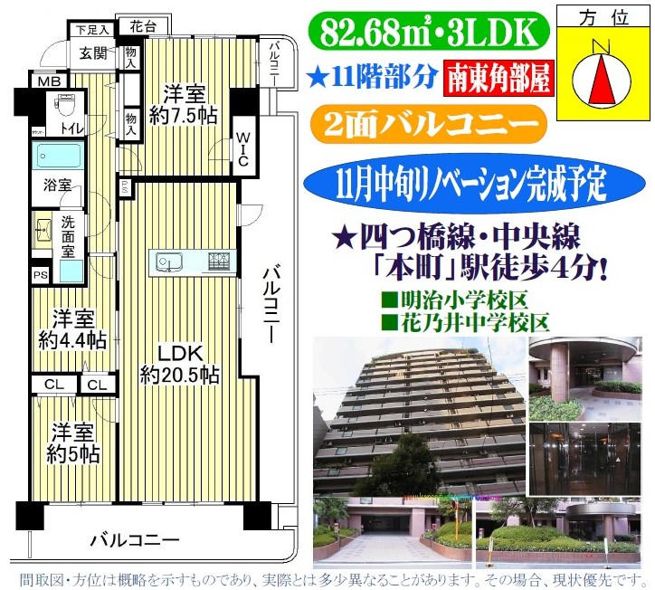 1998年2月建築/15階建の11階部分/南東角部屋/2面バルコニー/専有面積82.68uの3LDK/2025年11月中旬リノベーション完成予定/宅配ボックス/オートロック/大阪メトロ四つ橋・中央線「本町」駅徒歩4分/大阪メトロ千日前線「阿波座」駅徒歩8分/※駐車場空有:月額39,600円(2028年8月現在)/※町会費:月額300円/※水道基本料金:3,080円(2ヵ月毎。別途使用料あり)/※令和7年度固定資産税・都市計画税:年額152,378円/※花台面積:0.86u/※ペット飼育不可/