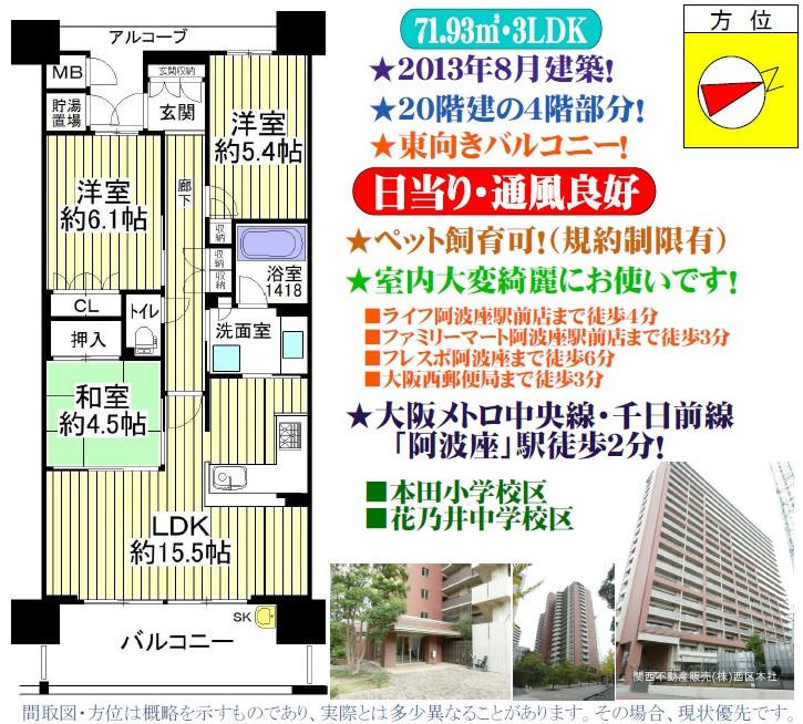 | 2013年8月建築/20階建の5階部分/東向きバルコニー/専有面積71.93uの3LDK/2026年5月中旬改装工事完了予定/アルコーブ付/オール電化マンション/アウトポール設計/二重床・二重天井/ゴミドラムあり(24時間ゴミ出し可)/モニター付オートロック/インターネット接続可/CATV/CS/宅配ボックス/防犯カメラ/24時間セキュリティ「アウル24」/ペット飼育可(規約制限有※犬・猫あわせて2匹まで可能)/キッズ・パーティスタジオ/スーパーライフ阿波座駅前店まで約300m(徒歩4分)/フレスポ阿波座まで約400m(徒歩5分)/ファミリーマート阿波座駅前店まで約220m(徒歩3分)/大阪西郵便局まで約220m(徒歩3分)/公益財団法人日本生命済生会日本生命病院まで約50m(徒歩1分)/大阪市立本田小学校まで約470m(徒歩6分)/大阪市立花乃井中学校まで約890m(徒歩12分)/ファミリーマート日本生命病院店まで約140m(徒歩2分)/セブンイレブン大阪江之子島1丁目店まで約310m(徒歩4分)/大阪メトロ中央線・千日前線「阿波座」駅徒歩2分/※アルコーブ面積:6.18u/※エコキュート貯湯ユニット置場面積:1.00u/ |