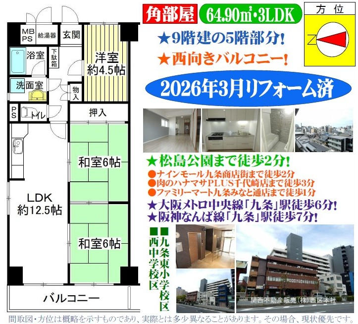9階建の5階部分/角部屋/西向きバルコニー/専有面積64.90uの3LDK/2026年3月末リフォーム完成済み/松島公園まで徒歩2分/ファミリーマート九条みなと通店まで徒歩1分/スーパー肉のハナマサPLUS千代崎店まで徒歩3分/C&Cエンド九条店まで徒歩5分/ナインモール九条商店街まで徒歩2分/イオンモール大阪ドームシティまで徒歩8分/大阪市立九条東小学校まで徒歩9分/大阪市立西中学校まで徒歩4分/3wayアクセス(大阪メトロ中央線「九条」駅徒歩6分/阪神なんば線「九条」駅徒歩7分/大阪メトロ長堀鶴見緑地線「ドーム前千代崎」駅徒歩9分)/※ペット飼育不可/