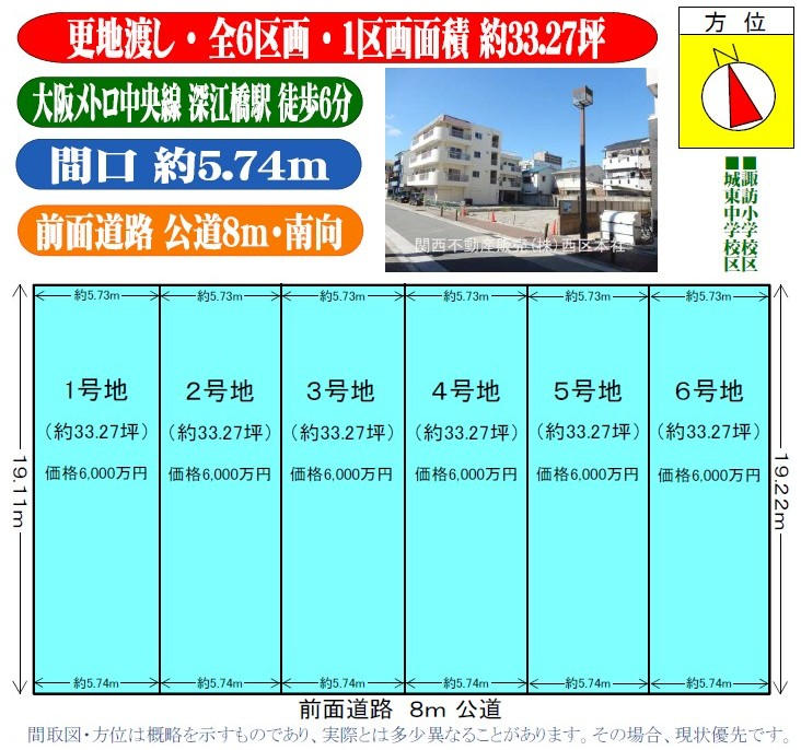 全6区画/1区画土地面積:109.97u(約33.27坪)/1区画価格6,000万円/土地間口:約5.74m/前面道路幅員:8m公道/解体・更地渡し(一部解体済)/建築条件無し(建築承ります)/第一種住居地域(建ぺい率80%・容積率200%)/大阪メトロ中央線「深江橋」駅徒歩6分/