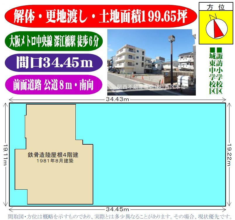 土地面積:659.87u(約199.65坪)/解体・更地渡し(一部解体済み)/建築条件無し/南向き/土地間口約34.45m/前面道路幅員8m公道/第一種住居地域(建ぺい率80%・容積率200%)/大阪メトロ中央線「深江橋」駅徒歩6分/