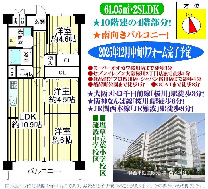 10階建の4階部分/南向きバルコニー/専有面積61.05uの2SLDK/2025年12月中旬全面リフォーム完了予定/大阪市立塩草立葉小学校まで約700m(徒歩9分)/大阪市立難波中学校まで約700m(徒歩9分)/ローソン桜川2丁目店まで約190m(徒歩3分)/ライフ塩草店まで約680m(徒歩9分)/ダイコクドラッグ桜川駅前店まで約310m(徒歩4分)/大阪島屋まで約1,400m(徒歩18分/OCATまで約620m(徒歩8分)/大阪メトロ千日前線「桜川」駅徒歩3分・阪神なんば線「桜川」駅徒歩7分・JR関西本線「JR難波」駅徒歩8分/
