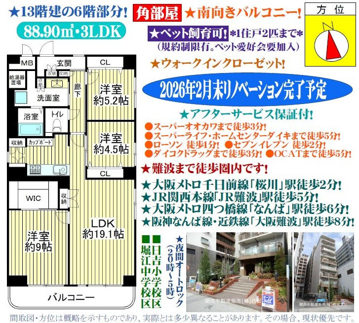 | 13階建の6階部分/角部屋/南向きバルコニー/専有面積88.90uの3LDK/2026年2月末リノベーション完成予定/アフターサービス保証付/2重サッシ/ペット飼育可(規約制限有)/夜間(20:00〜5:00)オートロック/なんば徒歩圏エリア/大阪メトロ千日前線「桜川」駅徒歩2分・JR大和路線「JR難波」駅徒歩5分・大阪メトロ四つ橋線「なんば」駅徒歩6分・阪神なんば線・近鉄線「大阪難波」駅徒歩8分・阪神なんば線「桜川」駅徒歩6分・大阪メトロ御堂筋線「なんば」駅徒歩10分/※ペット飼育の場合:ペット愛好会に要加入(年間1,000円)/ |