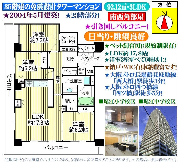 | 2004年5月建築/35階建の免震設計タワーマンション/23階部分/南西角部屋/引き回しバルコニー/専有面積92.12uの3LDK/アルコーブ付/トランクルーム付/2重床・2重天井構造/フラット設計/オール電化/24時間換気システム/TVモニター付インターホン/オートロック/24時間ゴミ出し可能/宅配ボックス/ペット飼育可(規約制限有)/3重防犯システム/24時間有人管理/コンシェルジュサービス有/28階にスカイラウンジ有/ビッグビーンズWEST本店まで徒歩約1分(約80m)/ライフ西大橋店まで徒歩約3分(約240m)/イオンフードスタイル四ツ橋店まで徒歩約4分(約280m)/セブンイレブン大阪新町1丁目店まで徒歩約2分(約150m)/ローンストア100西区新町店まで徒歩約2分(約140m)/大阪市立堀江小学校東学舎まで徒歩約8分(約600m)/大阪市立堀江中学校まで徒歩約15分(約1200m)/新町北公園まで徒歩約3分(約170m)/新町南公園まで徒歩約2分(約140m)/なにわ筋新町郵便局まで徒歩約4分(約290m)/大阪メトロ長堀鶴見緑地線「西大橋」駅徒歩3分・大阪メトロ四つ橋線「四ツ橋」駅徒歩4分・大阪メトロ御堂筋線「心斎橋」駅徒歩9分/ |
