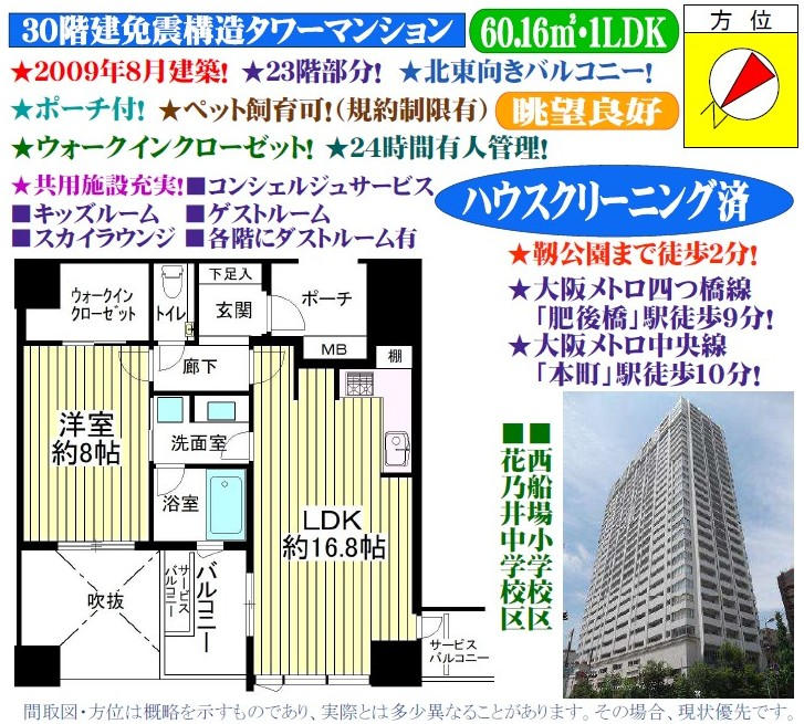 | 2009年8月建築/積水ハウス分譲の30階建免震タワーマンション/23階部分/北東向きバルコニー/専有面積60.16uの1LDK/ハウスクリーニング済み/専用ポーチ付/ウォークインクローゼット/ダブル・オートロック及びインターホンによるトリプル・カラーモニターシステムセキュリティ/ペット飼育可(但し、管理規約により一定の制限があります)/24時間ゴミ出し可/宅配ボックス/24時間有人管理/各種コンシェルジュサービス/スカイラウンジ/キッズルーム/ゲストルーム/各階にダストルーム有/靱公園まで約100m/スーパーライフ土佐堀店まで約490m/ファミリーマート江戸堀二丁目店まで約140m/大阪江戸堀郵便局まで約150m/ホームセンターコーナン西本町店まで約640m/セリアビオラル靭店まで約565m/西船場小学校まで約405m/花乃井中学校まで約405m/大阪メトロ四つ橋線「肥後橋」駅徒歩8分/大阪メトロ四つ橋線「本町」駅徒歩9分/大阪メトロ御堂筋線「淀屋橋」駅徒歩13分/※ホームセキュリティサービス料金:月額1,077円/※インターネット設備維持分担金:月額330円/※窓ガラス清掃費:月額628円/※自治会費:年額3,000円/ |