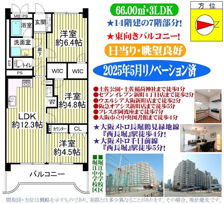 14階建の7階部分/東向きバルコニー/専有面積66.00uの3LDK/日当り・眺望良好/2025年5月リノベーション済/ウォークインクローゼット2カ所あり/先行配管施工で全室エアコン設置可能/阪急オアシス新町店まで約380m(徒歩5分)/コーヨー堀江店まで約500m(徒歩7分)/フレスポ阿波座まで約550m(徒歩7分)/堀江小学校西学舎まで約120m(徒歩2分)/堀江中学校まで約300m(徒歩4分)/土佐公園・土佐稲荷神社まで約50m(徒歩1分)/セブンイレブン大阪新町4丁目店まで約130m(徒歩2分)/ウエルシア大阪新町店まで約150m(徒歩2分)/大阪市立中央図書館まで約300m(徒歩4分)/西区役所まで約250m(徒歩4分)/大阪日吉郵便局まで約400m(徒歩5分)/2沿線利用可(大阪メトロ千日前線・長堀鶴見緑地線「西長堀」駅徒歩5分)/ |