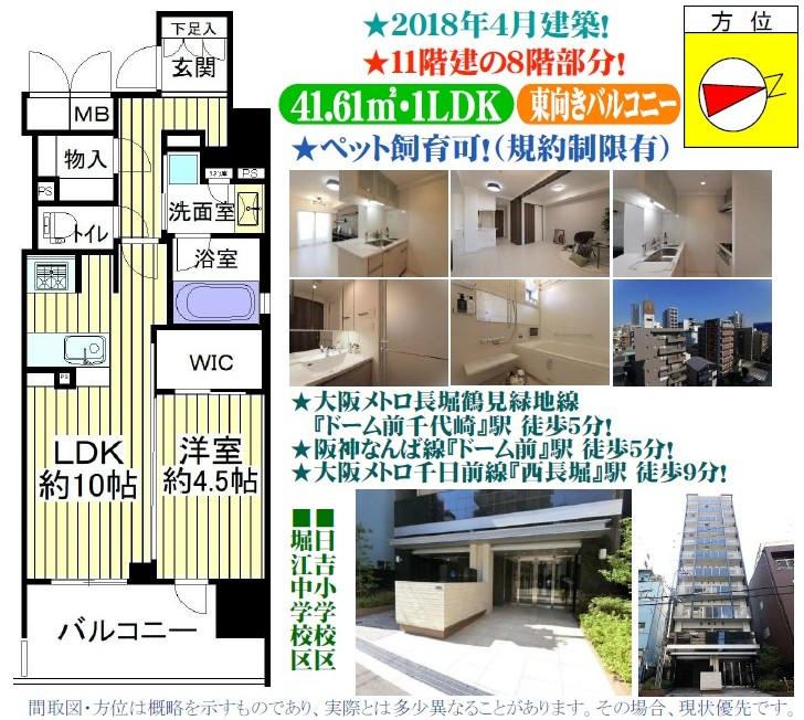 2018年4月建築/アウトポール工法/フラットフロア/11階建の8階部分/東・北角部屋/東向きバルコニー/日当り・通風良好/専有面積41.61uの1LDK/ウォークインクローゼット/リビング・ダイニング部分にガス温水式床暖房あり/システムカウンターキッチン/1416サイズ窓付きの浴室/浴室暖房換気乾燥機/三面鏡付洗面化粧台/温水洗浄便座付トイレ/24時間換気システム/TVモニター付インターホン/宅配ボックス/オートロック/防犯カメラ/BS/CS/CATV/ペット飼育可(飼育細則有)/イオンモール大阪ドームシティ店まで約600m/成城石井イオンモール大阪ドームシティ店まで約600m/セブンイレブン大阪南堀江4丁目西店まで約140m/スギ薬局北堀江店まで約560m/ダイコクドラッグ西長堀店まで約600m/関西スーパー南堀江店まで約500m/スーパーKOHYO堀江店まで約620m/大阪市立中央図書館まで約700m/大阪メトロ長堀鶴見緑地線「ドーム前千代崎」駅徒歩5分/阪神電鉄阪神なんば線「ドーム前」駅徒歩5分/大阪メトロ千日前線・長堀鶴見緑地線「西長堀」駅徒歩9分/ |