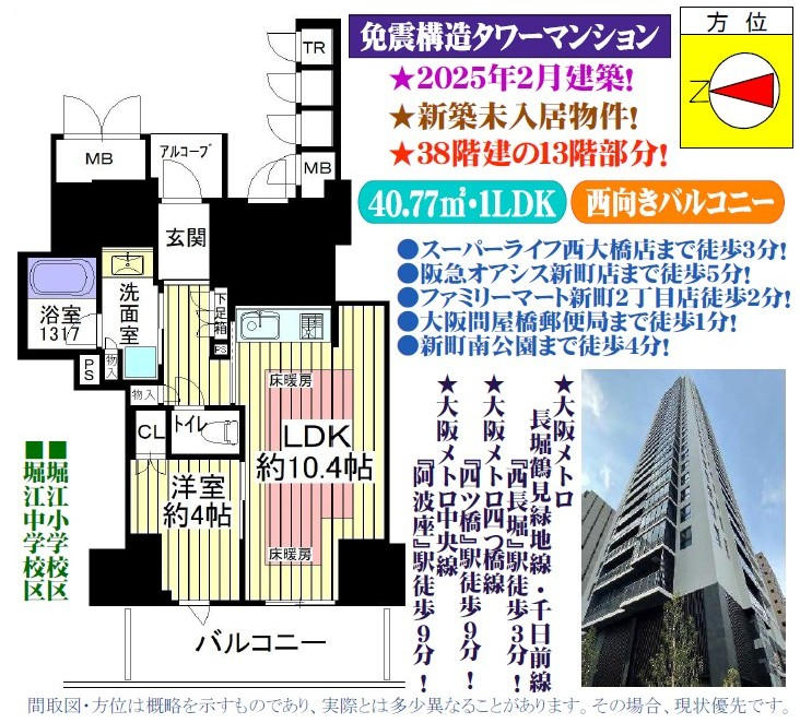 2025年2月建築/38階建免震構造タワーレジデンス/13階部分/西向きバルコニー/専有面積40.77uの1LDK/アルコーブ付/ペット飼育可(規約による制限あり)/スーパーライフ西大橋店まで徒歩3分/堀江小学校東学舎まで徒歩5分/堀江中学校まで徒歩9分/3WAYアクセス(大阪メトロ千日前線「西長堀」駅徒歩3分・大阪メトロ長堀鶴見緑地線「西長堀」駅徒歩3分・大阪メトロ四つ橋線「四ツ橋」駅徒歩9分)/※インターネット使用料:月額2,090円/ |