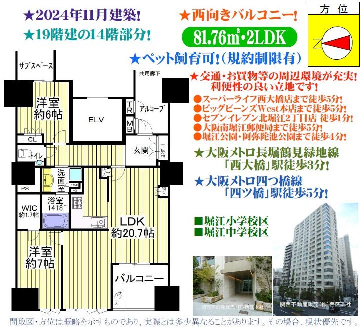 | 2024年11月建築/19階建の14階部分/西向きバルコニー/専有面積81.76uの2LDK/3LDKから2LDKに間取変更しています/新築時オプション有(約400万円相当)/ペット飼育可(規約制限有)/【共用施設】・コンシェルジュサービス・ゴミ回収サービス・メールポスト一体型宅配ボックス・インターホンシステム「dearis」・ハンズフリーシステム・ZEH-M Oriented・熱量電池エネファーム・空気環境配慮仕様「エアキス」・パーティールーム(4階)・ラウンジ(1階)・スターバックスコーヒープログラム・レンタサイクル(一部有料)/ライフ西大橋店まで徒歩5分/ビッグビーンズWest本店まで徒歩5分/セブンイレブン大阪北堀江2丁目店まで徒歩1分/クリスタ長堀まで徒歩7分/堀江敬愛保育園まで徒歩4分/新町南公園まで徒歩3分/堀江公園まで徒歩4分/阿弥陀池公園まで徒歩4分/大阪堀江郵便局まで徒歩5分/大阪メトロ長堀鶴見緑地線「西大橋」駅徒歩3分・大阪メトロ四つ橋線「四ツ橋」駅徒歩5分・大阪メトロ御堂筋線「心斎橋」駅徒歩10分/※アルコーブ面積:3.90u/サブスペース面積:4.04u/ |