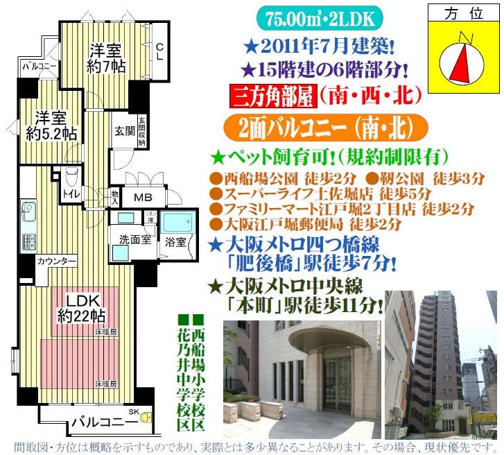 | 2011年7月建築/15階建の6階部分/専有面積75uの2LDK/南・西・北向きの三方角部屋/南向きバルコニー/バルコニーにスロップシンク有/宅配BOX/オートロック/24時間セキュリティ/ペット飼育可能(規約制限有)/西船場小学校(約240m)/花乃井中学校(約560m)/スーパーライフ土佐堀店(約350m)/セブンイレブン大阪京町堀1丁目店(約160m)/ファミリーマート江戸堀二丁目店(約140m)/コーナン西本町店(約620m)/ドラッグストアアカカベ阿波座店(約720m)/靱公園(約170m)/西船場公園(約100m)/住友病院(約880m)/KOHYO淀屋橋店(約960m)/阪急オアシス中之島店(約1120m)/大阪メトロ四つ橋線「肥後橋」駅徒歩7分/大阪メトロ四つ橋線「本町」駅徒歩9分/大阪メトロ中央線「本町」駅徒歩11分/京阪中之島線「中之島」駅徒歩11分/※ホームセキュリティ使用料:月額840円/※町内会費:月額250円/※ペットクラブ費:飼育者は一匹に付月額300円(犬又は猫合わせて2匹まで可。規約制限有)/ |