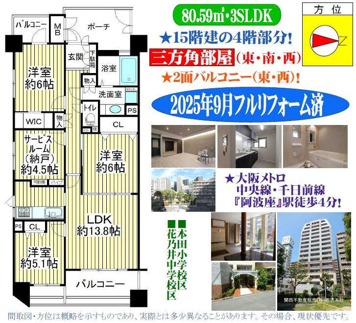 | 2004年9月建築/15階建の4階部分/三方角部屋/2面バルコニー(東・西)/専有面積80.59uの3SLDK/2025年9月全面リフォーム済【システムキッチン新調(食器洗い乾燥機・浄水器付)、浴室ユニットバス新調、浴室暖房乾燥機新調、洗面化粧台新調、給湯器(追焚付)新調、トイレ新調、建具新調、フローリング張替、クロス貼替、CF張替等】/専用ポーチ有/ウォークインクローゼット/インターネット対応/充実のセキュリティ/オートロック/宅配ボックス/ライフ阿波座駅前店まで約417m/BIO-RAL(ビオラル)靭店まで約498m/セブンイレブン 大阪江之子島1丁目店まで約223m/ファミリーマート日本生命病院店まで約153m/2WAYアクセス(大阪メトロ千日前線「阿波座」駅徒歩4分・大阪メトロ中央線「阿波座」駅徒歩4分)/※ペット飼育不可/ |