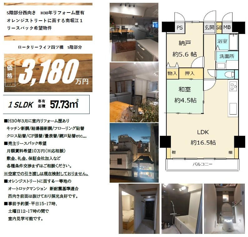 リースバック希望物件(希望月額賃料10万円。敷金、礼金、保証会社加入など、各種条件ご相談下さい)/10階建の5階部分/西向きバルコニー/専有面積57.73uの1SLDK/2018年3月に室内リフォーム履歴有【キッチン新調。給湯器新調。フローリング張替。クロス貼替。CF張替。畳表替。網戸貼替.etc】/オートロック/南堀江立花通り(オレンジストリート)に面しております/スーパー肉のハナマサPLUS堀江店まで徒歩4分(約300m)/CoDeli南堀江2丁目店まで徒歩5分(約360m)/ヤマザキYショップ南堀江川嵜店まで徒歩2分(約130m)/セブンイレブン大阪南堀江1丁目店まで徒歩2分(約150m)/ファミリーマート南堀江1丁目店まで徒歩3分(約200m)/スギドラッグ南堀江店まで徒歩3分(約210m)/堀江公園まで徒歩1分(約80m)/日吉小学校まで約980m(徒歩13分)/堀江中学校まで約1000m(徒歩13分)/アスク南堀江保育園まで約180m(徒歩3分)/大阪メトロ四つ橋線「四ツ橋」駅徒歩5分/大阪メトロ長堀鶴見緑地線「西大橋」駅徒歩6分/大阪メトロ千日前線「桜川」駅徒歩8分/※組合協力金:月額3,000円/※現状有姿取引/※契約不適合責任免責/