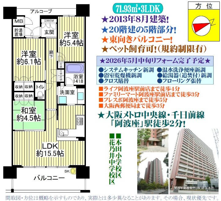 2013年8月建築/20階建の5階部分/東向きバルコニー/専有面積71.93uの3LDK/2026年5月中旬改装工事完了予定/アルコーブ付/オール電化マンション/アウトポール設計/二重床・二重天井/ゴミドラムあり(24時間ゴミ出し可)/モニター付オートロック/インターネット接続可/CATV/CS/宅配ボックス/防犯カメラ/24時間セキュリティ「アウル24」/ペット飼育可(規約制限有※犬・猫あわせて2匹まで可能)/キッズ・パーティスタジオ/スーパーライフ阿波座駅前店まで約300m(徒歩4分)/フレスポ阿波座まで約400m(徒歩5分)/ファミリーマート阿波座駅前店まで約220m(徒歩3分)/大阪西郵便局まで約220m(徒歩3分)/公益財団法人日本生命済生会日本生命病院まで約50m(徒歩1分)/大阪市立本田小学校まで約470m(徒歩6分)/大阪市立花乃井中学校まで約890m(徒歩12分)/ファミリーマート日本生命病院店まで約140m(徒歩2分)/セブンイレブン大阪江之子島1丁目店まで約310m(徒歩4分)/大阪メトロ中央線・千日前線「阿波座」駅徒歩2分/※アルコーブ面積:6.18u/※エコキュート貯湯ユニット置場面積:1.00u/