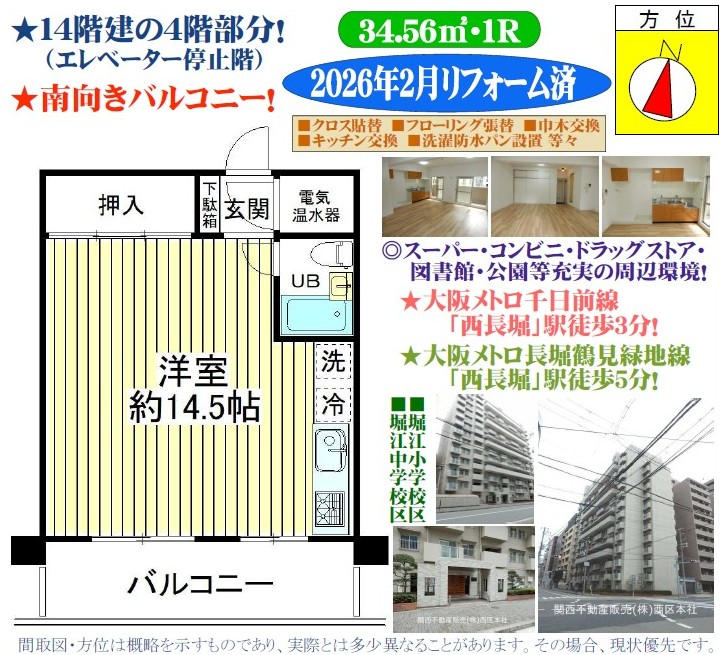 鹿島建設の設計・施工/14階建の4階部分/南向きバルコニー/専有面積34.56uのワンルーム/2026年2月リフォーム済/●クロス貼替●フローリング張替●巾木交換●キッチン新調●洗濯防水パン設置等々/コーヨー堀江店まで約210m(徒歩3分)/CoDeLi南堀江2丁目店まで約270m(徒歩4分)/ファミリーマート南堀江三丁目店まで約140m(徒歩2分)/ローソン南堀江三丁目店まで約160m(徒歩2分)/堀江小学校東学舎まで約350m(徒歩5分)/堀江中学校まで約380m(徒歩5分)/日吉幼稚園まで約820m(徒歩11分)/ソフィア南堀江保育園まで約160m(徒歩2分)/スギドラッグ北堀江店まで約250m(徒歩4分)/大阪日吉郵便局まで約420m(徒歩6分)/高台橋公園まで約100m(徒歩2分)/阿弥陀池公園まで約150m(徒歩2分)/大阪メトロ千日前線「西長堀」駅徒歩3分/大阪メトロ長堀鶴見緑地線「西長堀」駅徒歩5分/阪神なんば線「桜川」駅徒歩10分/※ペット飼育不可/※町会費:月額200円/