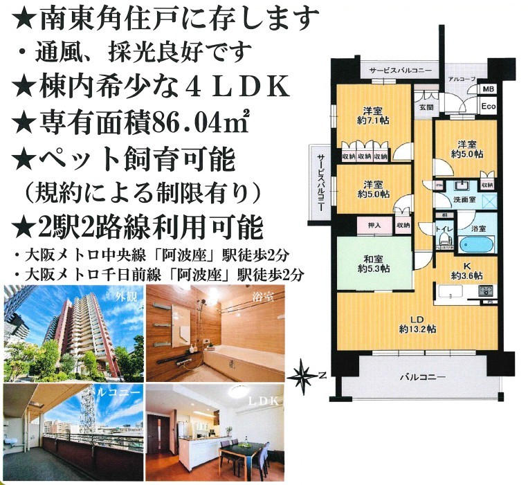 | 2013年8月建築/20階建の6階部分/南東角部屋/東向きバルコニー/南面・西面にサービスバルコニー有/専有面積86.04uの4LDK/アルコーブ付/オール電化マンション/アウトポール設計/二重床・二重天井/ゴミドラムあり(24時間ゴミ出し可)/モニター付オートロック/インターネット接続可/CATV/CS/宅配ボックス/防犯カメラ/24時間セキュリティ「アウル24」/ペット飼育可(規約制限有※犬・猫あわせて2匹まで可能)/キッズ・パーティスタジオ/万代フレスポ阿波座店まで約670m(徒歩9分)/ライフ阿波座駅前店まで約400m(徒歩5分)/公益財団法人日本生命済生会日本生命病院まで約50m(徒歩1分)/大阪市立本田小学校まで約470m(徒歩6分)/大阪市立花乃井中学校まで約890m(徒歩12分)/大阪西郵便局まで約190m(徒歩3分)/ファミリーマート日本生命病院店まで約140m(徒歩2分)/セブンイレブン大阪江之子島1丁目店まで約310m(徒歩4分)/キリン堂フレスポ阿波座店まで約670m(徒歩9分)/大阪メトロ中央線・千日前線「阿波座」駅徒歩2分/ |