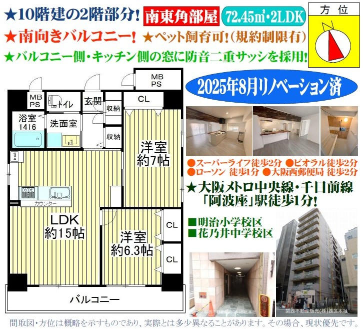 | 10階建の2階部分/角部屋/南向きバルコニー/専有面積72.45uの2LDK/2025年8月リノベーション済/バルコニー側・キッチン側の窓に防音二重サッシを採用/ペット飼育可(規約制限有)/ライフ阿波座駅前店まで徒歩2分/ローソン靱本町三丁目店まで徒歩1分/セブンイレブン大阪江之子島1丁目店まで徒歩2分/ビオラル靱店まで徒歩2分/靭公園まで徒歩4分/大阪西郵便局まで徒歩2分/日本生命病院まで徒歩4分/大阪メトロ中央線・千日前線「阿波座」駅徒歩2分/※組合費:月額300円/ |