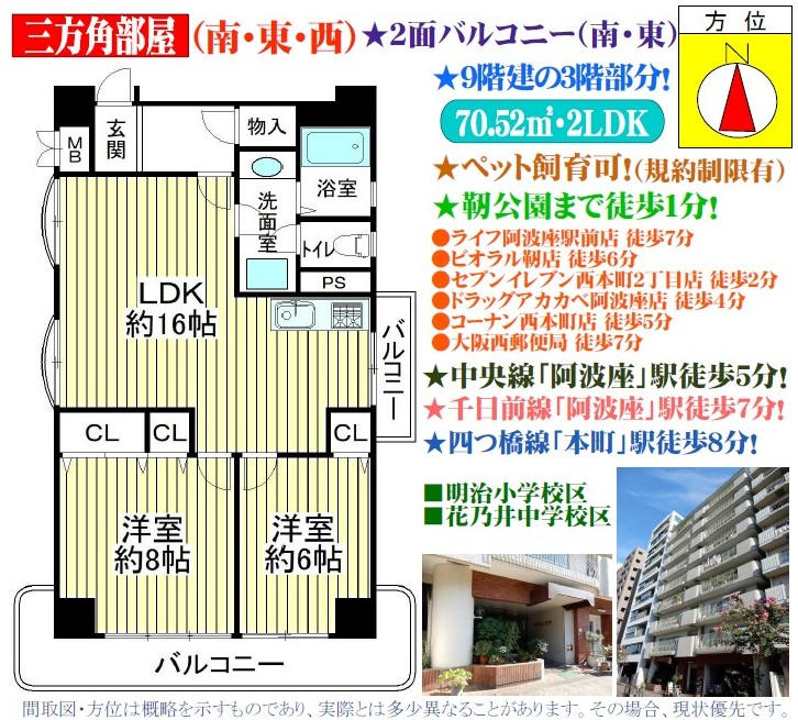 | 9階建の3階部分/三方角部屋(南・東・西)/2面バルコニー(南・東)/専有面積70.52uの2LDK/ペット飼育可(規約制限有)/靭公園まで徒歩1分/ライフ阿波座駅前店まで徒歩7分/ビオラル靭店まで徒歩6分/セブンイレブン大阪西本町2丁目店まで徒歩2分/コーナン西本町店まで徒歩5分/ライフMiniel西本町店まで徒歩5分/ドラッグアカカベ阿波座店まで徒歩4分/日本生命病院まで徒歩9分/大阪西郵便局まで徒歩7分/大阪市立明治小学校まで約550m/大阪市立花乃井中学校まで約450m/大阪メトロ中央線「阿波座」駅徒歩5分/大阪メトロ千日前線「阿波座」駅徒歩7分/大阪メトロ四つ橋線「本町」駅徒歩8分/※町会費:月額500円/※契約不適合責任免責/ |