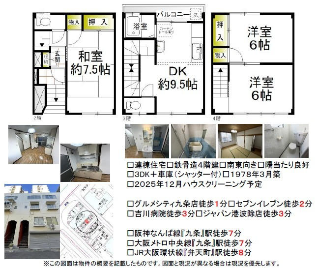 | 連棟住宅(鉄骨造の7戸1住宅)/土地面積30.81u/鉄骨造4階建/1978年3月建築/南東向き・日当り良好/3DK+車庫(シャッター付)/2025年12月ハウスクリーニング予定/グルメシティ九条店徒歩1分/セブンイレブン徒歩2分/ジャパン港波除店徒歩3分/3沿線利用可能/大阪メトロ中央線「九条」駅徒歩7分・阪神なんば線「九条」駅徒歩7分・JR大阪環状線「弁天町」駅徒歩8分/※修繕積立金:月額5,000円要/※私道負担(74.13u・持分7分の1)/※前面道路は建築基準法上の道路ではありません/※再建築不可/※令和7年度固定資産税・都市計画税:年額43,498円/ |