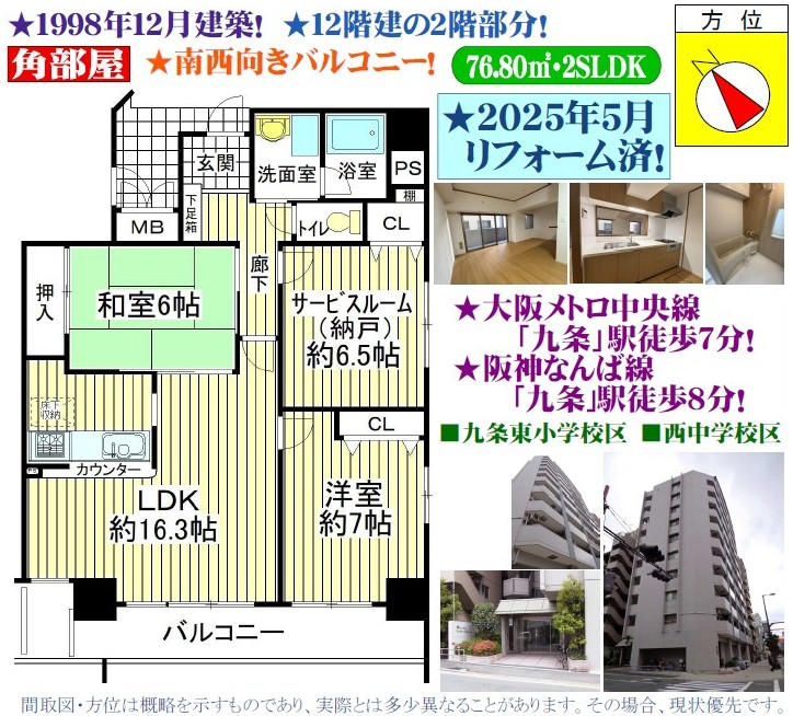| 1998年12月建築/12階建の2階部分/南東角部屋/南向きバルコニー/専有面積76.80uの2SLDK/2025年5月リフォーム済み(システムキッチン・浴室ユニットバス・トイレ・洗面台新調、全室天井クロス貼替、洋室・納戸・廊下・リビングフローリング貼替、洗面室・トイレクッションフロア張替、和室畳・襖貼替)/浴室乾燥機/追焚き機能付/モニター付インターホン/モニター付オートロック/宅配BOX/大阪市立九条東小学校まで徒歩10分(約750m)/大阪市立西中学校まで徒歩7分(約550m)/C&Cエンド九条店まで徒歩4分(約300m)/スーパー肉のハナマサPLUS千代崎店まで徒歩4分(約260m)/マツモトキヨシ九条店まで徒歩5分(約350m)/セブンイレブン大阪ナインモール九条店まで徒歩5分(約350m)/セブンイレブン大阪千代崎2丁目店まで徒歩5分(約400m)/大阪市西区役所まで徒歩11分(約850m)/大阪市立中央図書館まで徒歩13分(約1,000m)/大阪メトロ中央線「九条」駅より徒歩7分・阪神なんば線「九条」駅徒歩8分・大阪メトロ長堀鶴見緑地線「ドーム前千代崎」駅徒歩9分/※ペット飼育不可/ |