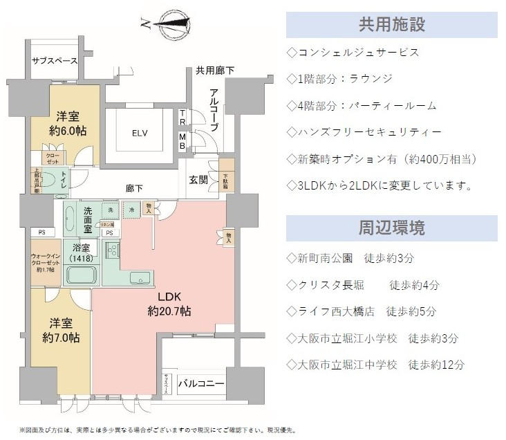 2024年11月建築/19階建の14階部分/西向きバルコニー/専有面積81.76uの2LDK/3LDKから2LDKに間取変更しています/新築時オプション有(約400万円相当)/ペット飼育可(規約制限有)/【共用施設】・コンシェルジュサービス・ゴミ回収サービス・メールポスト一体型宅配ボックス・インターホンシステム「dearis」・ハンズフリーシステム・ZEH-M Oriented・熱量電池エネファーム・空気環境配慮仕様「エアキス」・パーティールーム(4階)・ラウンジ(1階)・スターバックスコーヒープログラム・レンタサイクル(一部有料)/ライフ西大橋店まで徒歩5分/ビッグビーンズWest本店まで徒歩5分/セブンイレブン大阪北堀江2丁目店まで徒歩1分/クリスタ長堀まで徒歩7分/堀江敬愛保育園まで徒歩4分/新町南公園まで徒歩3分/堀江公園まで徒歩4分/阿弥陀池公園まで徒歩4分/大阪堀江郵便局まで徒歩5分/大阪メトロ長堀鶴見緑地線「西大橋」駅徒歩3分・大阪メトロ四つ橋線「四ツ橋」駅徒歩5分・大阪メトロ御堂筋線「心斎橋」駅徒歩10分/※アルコーブ面積:3.90u/サブスペース面積:4.04u/