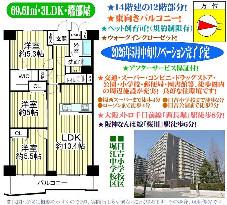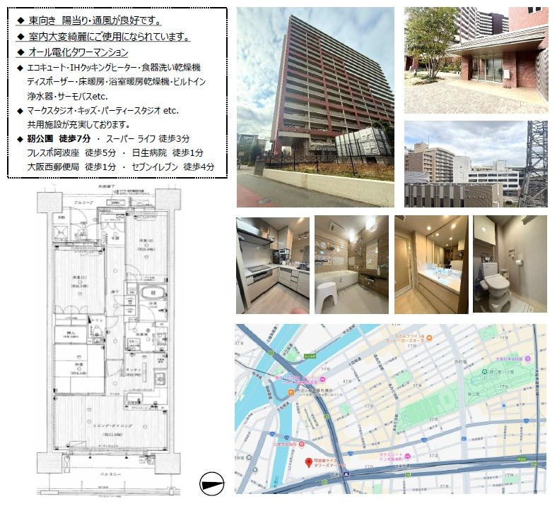 | (旧)大阪市住宅供給公社分譲/14階建の12階部分/東向きバルコニー/専有面積69.61uの3LDK/2026年5月中旬リノベーション完了予定/アフターサービス保証付/ペット飼育可能(飼育細則有)/生活環境充実の立地です(スーパー・コンビニ・ドラッグストア・公園・小学校・郵便局・区役所・図書館等徒歩圏)/大阪メトロ千日前線「西長堀」駅徒歩8分/阪神なんば線「桜川」駅徒歩6分/大阪メトロ長堀鶴見緑地線「ドーム前千代崎」駅徒歩8分/ |
