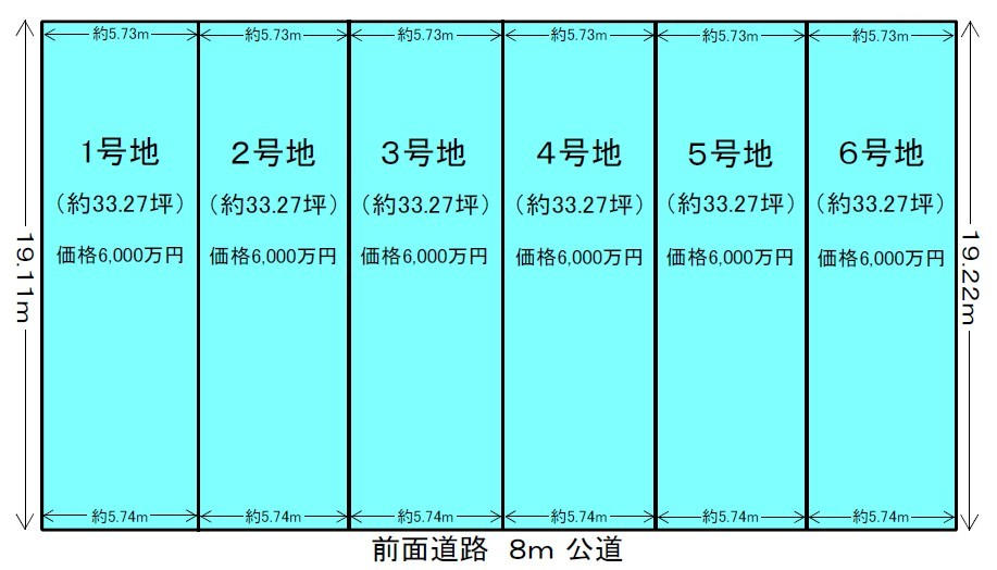 全6区画/1区画土地面積:109.97u(約33.27坪)/1区画価格6,000万円/土地間口:約5.74m/前面道路幅員:8m公道/解体・更地渡し(一部解体済)/建築条件無し(建築承ります)/第一種住居地域(建ぺい率80%・容積率200%)/大阪メトロ中央線「深江橋」駅徒歩6分/