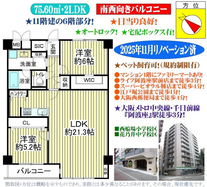 | 11階建の6階部分/南西向きバルコニー/専有面積75.60uの2LDK/2025年11月リノベーション済/アフターサービス保証付/オートロック/宅配ボックス/24時間ゴミ出し可/ペット飼育可(規約制限有)/スーパーライフ阿波座駅前店まで約240m(徒歩3分)/ビオラル靭店まで約280m(徒歩4分)/ファミリーマート京町堀三丁目店まで約10m(徒歩1分・マンション1階に有)/江戸堀公園まで約80m(徒歩1分)/都心のオアシス「靭公園」まで約450m(徒歩6分)/日本生命病院まで約280m(徒歩4分)/大阪西郵便局まで約290m(徒歩4分)/西船場小学校まで約900m(徒歩12分)/花乃井中学校まで約500m(徒歩7分)/大阪メトロ中央線・千日前線「阿波座」駅徒歩3分/京阪中之島線「中之島」駅徒歩10分/※オートロック使用料:月額2,000円/ |