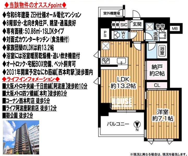 | 2024年3月建築/18階建の8階部分/北東角部屋/北向きバルコニー/専有面積50.86uの1LDK+納戸/眺望良好/ペット飼育可能(規約制限有)/オール電化マンション/靭公園まで徒歩3分/明治小学校まで徒歩8分/花乃井中学校まで徒歩約10分/コーナン西本町店まで徒歩5分/ファミリーマート西本町一丁目店まで徒歩2分/セブンイレブン大阪靭本町2丁目店まで徒歩3分/スギドラッグ信濃橋店まで徒歩2分/ビオラル靭店まで徒歩10分/スーパーライフ阿波座駅前店まで徒歩10分/大阪メトロ四つ橋線・中央線「本町」駅徒歩3分/※土地権利:定期賃借権/※借地期間:2095年11月30日まで/※地代:月額5,809円/解体準備金:月額2,300円/※インターネット使用料:月額2,189円/※地代保証金:139,416円(一括)/ |