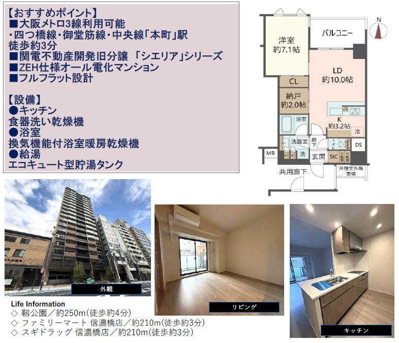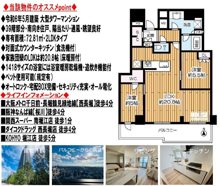 | 13階建の12階部分/南東角部屋/2面バルコニー(南・東)/専有面積75.24uの3LDK/2026年1月下旬リフォーム完成予定/モニター付オートロック/ペット飼育可(規約制限有)/阿弥陀池公園まで徒歩1分/高台橋公園まで徒歩3分/堀江小学校まで徒歩4分/堀江中学校まで徒歩9分/大阪メトロ長堀鶴見緑地線「西大橋」駅徒歩5分・大阪メトロ千日前線「西長堀」駅徒歩5分・大阪メトロ四つ橋線「四ツ橋」駅徒歩8分/ |