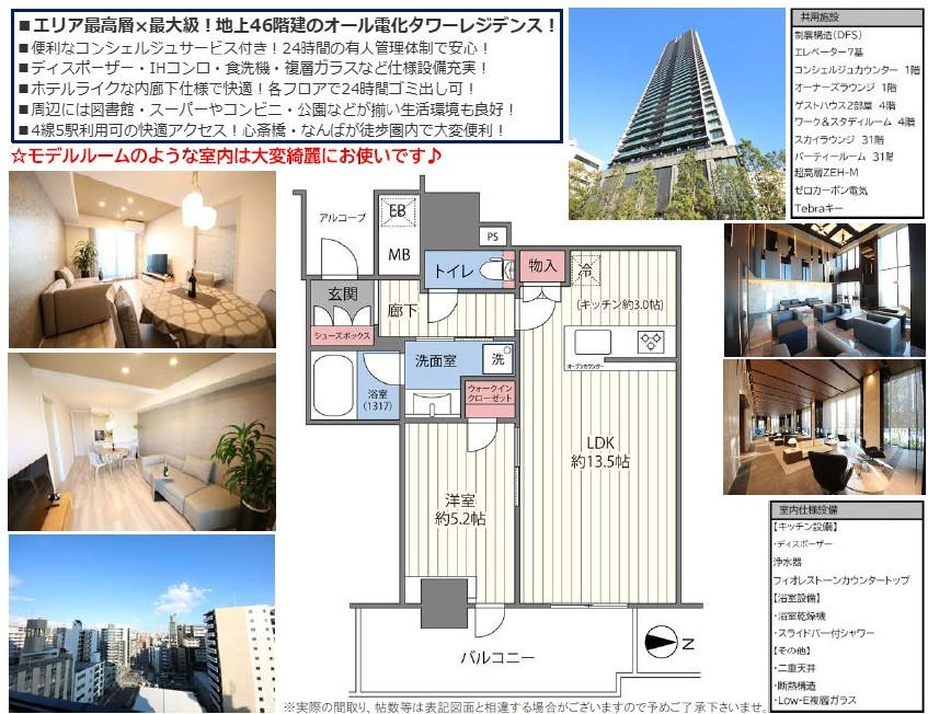 | 2024年8月建築/制振構造(DFS)/超高層ZEH-M/オール電化/ゼロカーボン電気/46階建の8階部分/東向きバルコニー/専有面積45.15uの1LDK/アルコーブ付/ウォークインクローゼット/Low-E複層ガラス採用/24時間ゴミ出し可/ペット飼育可(規約制限あり)/宅配BOX/エレベーター7基/コンシェルジュカウンター(1階)・オーナーズラウンジ(1階)・ゲストハウス2部屋(4階)・ワーク&スタディルーム(4階)・スカイラウンジ(31階)・パーティールーム(31階)/関西スーパー南堀江店まで徒歩2分/オレンジストリートまで徒歩2分/太陽南堀江保育園まで徒歩1分/大阪市立日吉小学校まで徒歩4分/高台橋公園まで徒歩5分/りそな銀行桜川支店まで徒歩4分/阪神なんば線「桜川」駅徒歩3分/大阪メトロ長堀鶴見緑地線・千日前線「西長堀」駅徒歩4分・大阪メトロ千日前線「桜川」駅徒歩4分/※インターネット使用料:月額2,189円(eo光ネット・マンションタイプ光全戸フル10Gコース)/ |