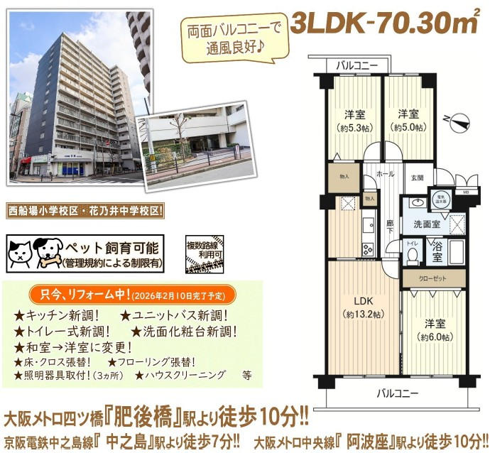 | 14階建の2階部分/2面バルコニー(西・東)/専有面積70.30uの3LDK/2026年2月10日リノベーション工事完了予定/ペット飼育可能(規約制限有)/ファミリーマート江戸堀3丁目店まで約170m/スーパーライフ土佐堀店まで約380m/靭公園まで約310m/花乃井公園まで約130m/住友病院まで約290m/西船場小学校まで約550m/花乃井中学校まで約110m/大阪江戸堀郵便局まで約350m/3WAYアクセス(京阪中之島線「中之島」駅徒歩8分・大阪メトロ四つ橋線「肥後橋」駅徒歩10分・大阪メトロ千日前線・中央線「阿波座」駅徒歩10分)/※設備充実積立金:2カ月毎に500円(奇数月徴収)/ |