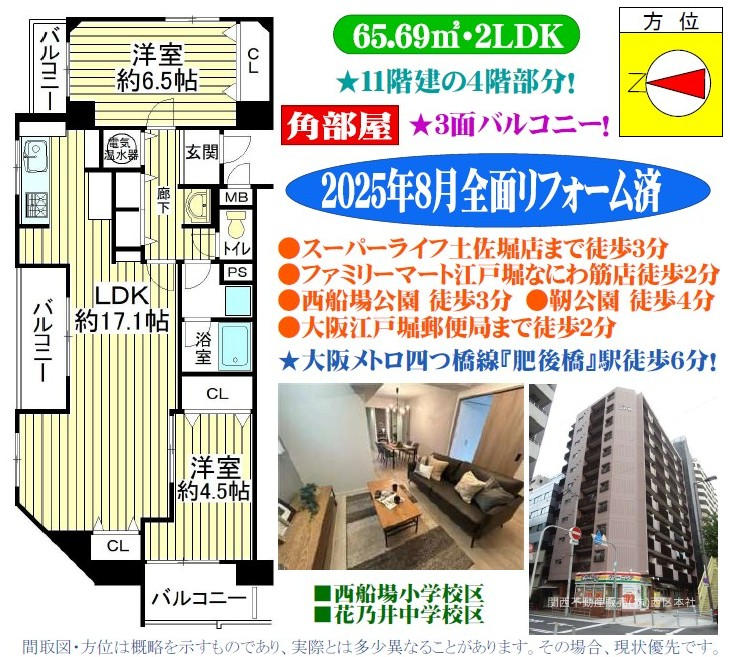 11階建の4階部分/西・北角部屋/3面バルコニー/専有面積65.69uの2LDK/2025年8月リフォーム済/ライフ土佐堀店まで約250m/西船場公園まで約190m/ファミリーマート江戸堀二丁目店まで約90m/ローソン江戸堀センタービル店まで約110m/西船場小学校まで約185m/花乃井中学校まで約400m/大阪メトロ四つ橋線「肥後橋」駅徒歩6分/大阪メトロ中央線・千日前線「阿波座」駅徒歩12分/大阪メトロ御堂筋線・中央線「本町」駅徒歩16分/