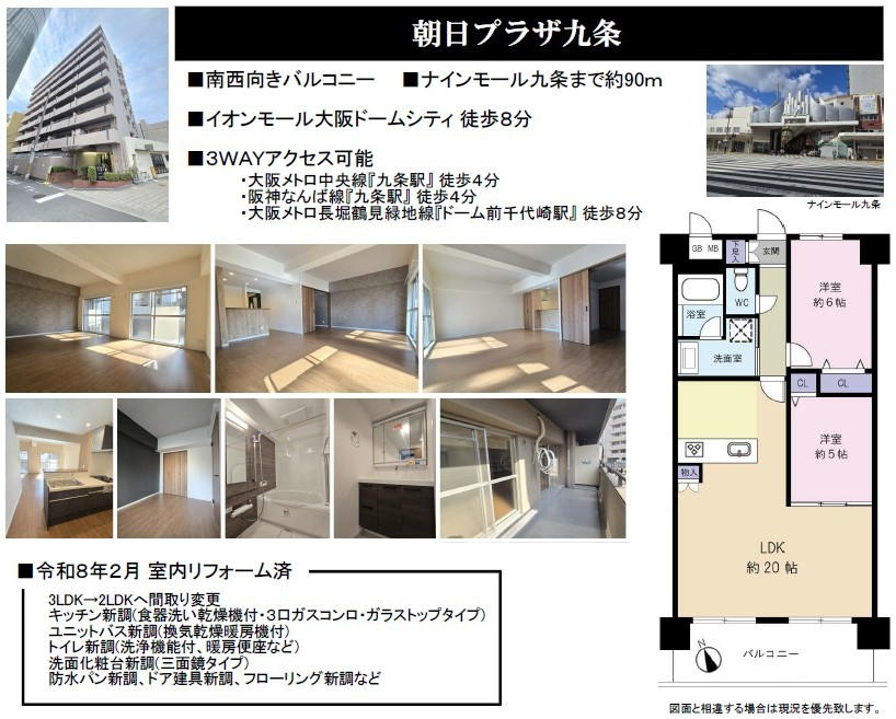 11階建の3階部分/南西向きバルコニー/専有面積60.20uの2LDK/2026年2月リフォーム済/ナインモール九条まで徒歩約2分/セブンイレブン大阪ナインモール九条店まで徒歩約2分/肉のハナマサPLUS 九条駅前店まで徒歩5分/松島公園まで徒歩約5分/イオンモール大阪ドームシティまで徒歩約7分/大阪メトロ中央線「九条」駅徒歩5分・阪神なんば線「九条」駅徒歩4分・大阪メトロ長堀鶴見緑地線「ドーム前千代崎」駅徒歩8分/