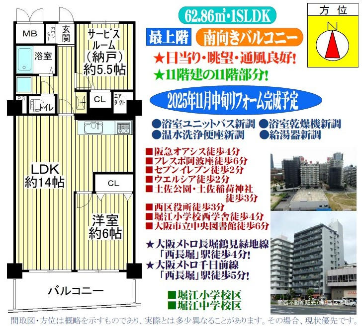 最上階(11階部分)/南向きバルコニー/日当り・眺望良好/専有面積62.86uの1SLDK/2025年11月リフォーム完了予定【●浴室ユニットバス新調●浴室乾燥機新調●温水洗浄便座新調●給湯器新調】/堀江小学校西学舎まで約300m/堀江中学校まで約500m/阪急オアシス新町店まで約270m/スーパーマンダイフレスポ阿波座店まで約450m/セブンイレブン大阪新町4丁目店まで約120m/ウエルシア大阪新町店まで約140m/土佐公園・土佐稲荷神社まで190m/大阪メトロ長堀鶴見緑地線「西長堀」駅徒歩4分/大阪メトロ千日前線「西長堀」駅徒歩5分/大阪メトロ中央線「阿波座」駅徒歩9分/※告知事項有り/※水道基本料金:月額1,540円/ |