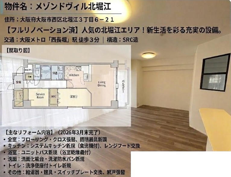 15階建の3階部分/西向きバルコニー/専有面積63.96㎡の1SLDK/2026年3月末リノベーション済/オートロック/宅配ボックス/スーパーKOHYO堀江店まで約230m(徒歩3分)/阿弥陀池公園まで約120m(徒歩2分)/堀江小学校東学舎まで約180m(徒歩3分)/堀江中学校まで約450m(徒歩6分)/ファミリーマート南堀江三丁目店まで約170m(徒歩3分)/大阪市立中央図書館まで約350m(徒歩5分)/大阪メトロ千日前線「西長堀」駅徒歩3分・大阪メトロ長堀鶴見緑地線「西長堀」駅徒歩3分/※自治会費:月額150円/